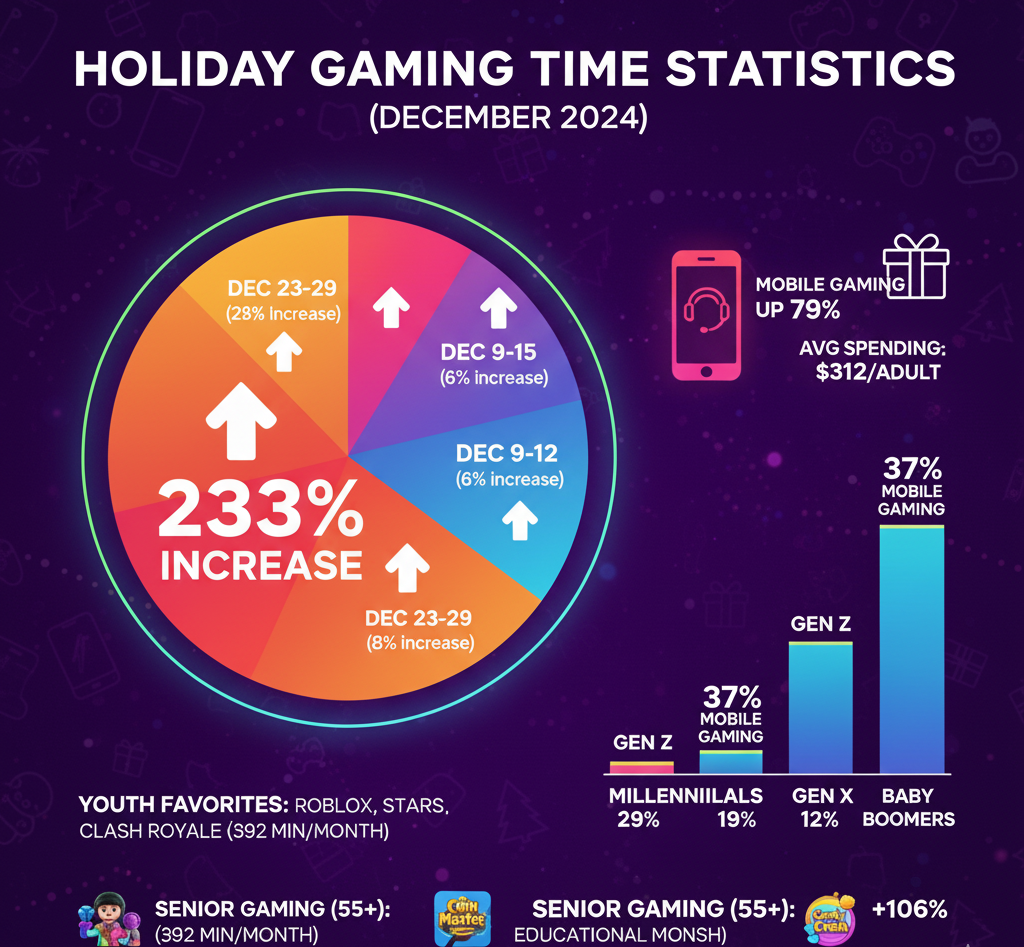This substantial engagement demonstrates that mobile gaming transcends age boundaries. Seniors found mobile games provided entertainment, mental stimulation, and social connection during the holiday period.