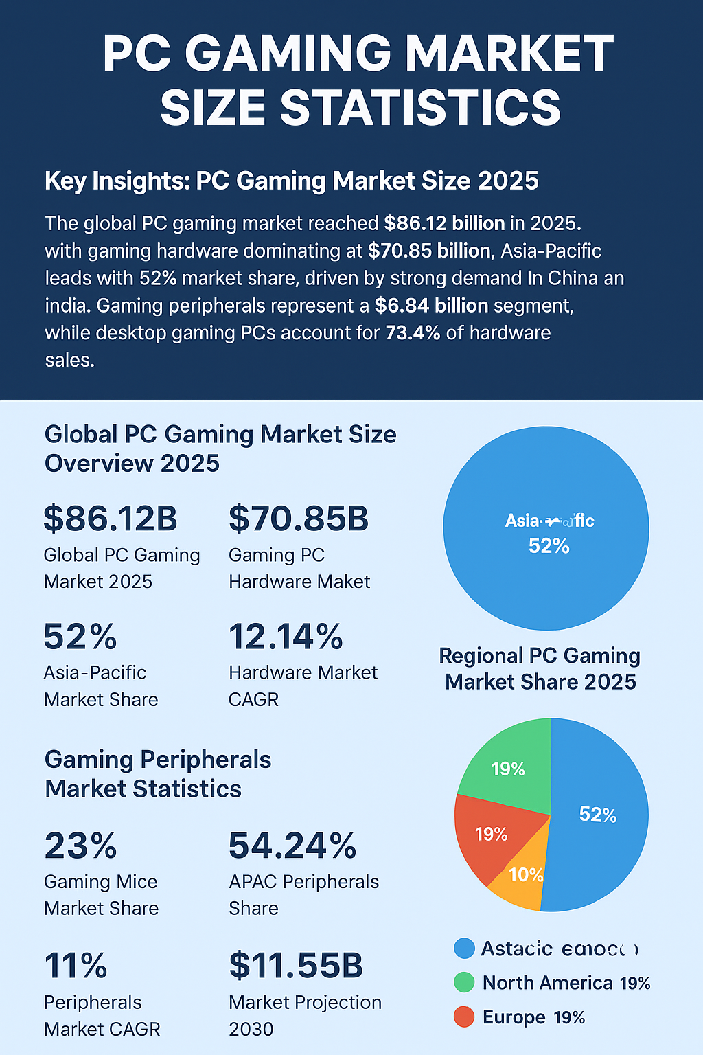 The global PC gaming market reached $86.12 billion in 2026, with gaming hardware dominating at $70.85 billion. Asia-Pacific leads with 52% market share, driven by strong demand in China and India. Gaming peripherals represent a $6.84 billion segment, while desktop gaming PCs account for 73.4% of hardware sales.